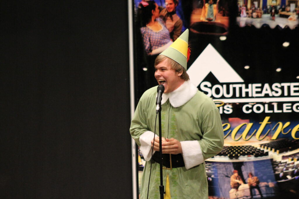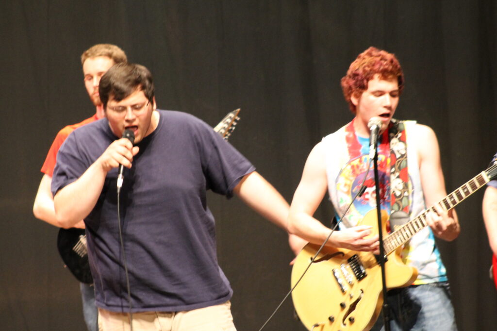 Marcia Miller of Marion (second from right) was the winner of the 2013 Falcon Follies talent show April 30 at Southeastern Illinois College with a vocal solo. Taking second place was Norris City’s Jared Mitchell (far right) also with a vocal solo.  And third place was awarded to the band, Deep Sun Mushroom Tribe, with an original song written by member, Travis Horton.   Band members (l-r) are Austin Parker of Eldorado, Sean Adams of Shawneetown, Travis Horton of Eldorado, Lucas Horn of Harrisburg, and Nathan Burns of Marion.  Fourteen acts including solos, a duet, a band, a monologue and a light show dance competed for cash prizes during the annual event.