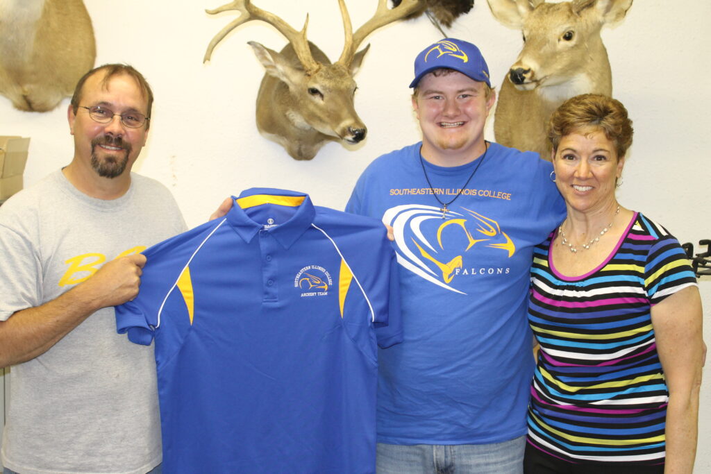 Illinois state archery champion Eric Janssen from Kankakee, center, has signed a statement of intent to compete for the 2013-14 Southeastern Illinois College national championship archery team. Janssen, who shoots in both the bow hunter and open divisions, has enrolled as a second-year student in the college’s welding program. Next to Janssen is SIC archery coach Roger Snodgrass of M&R Bowstrings (Harrisburg, Ill.) and Janssen’s mother, Mary Jean. Janssen is the current Illinois Target Archers Association (ITAA) Champion in 18 meters; ITAA Indoor Aggregate Champion 18/25 meters; Illinois State International Bowhunting Organization (IBO) Male Bowhunter Release Champion; and Illinois State Junior Olympic Archery Development (JOAD) Champion in 18 meters. Janssen joins a returning men’s team that captured the US Collegiate Archery Association’s national two-day aggregate scoring title in the bow hunter division at the University of Missouri in 2012.