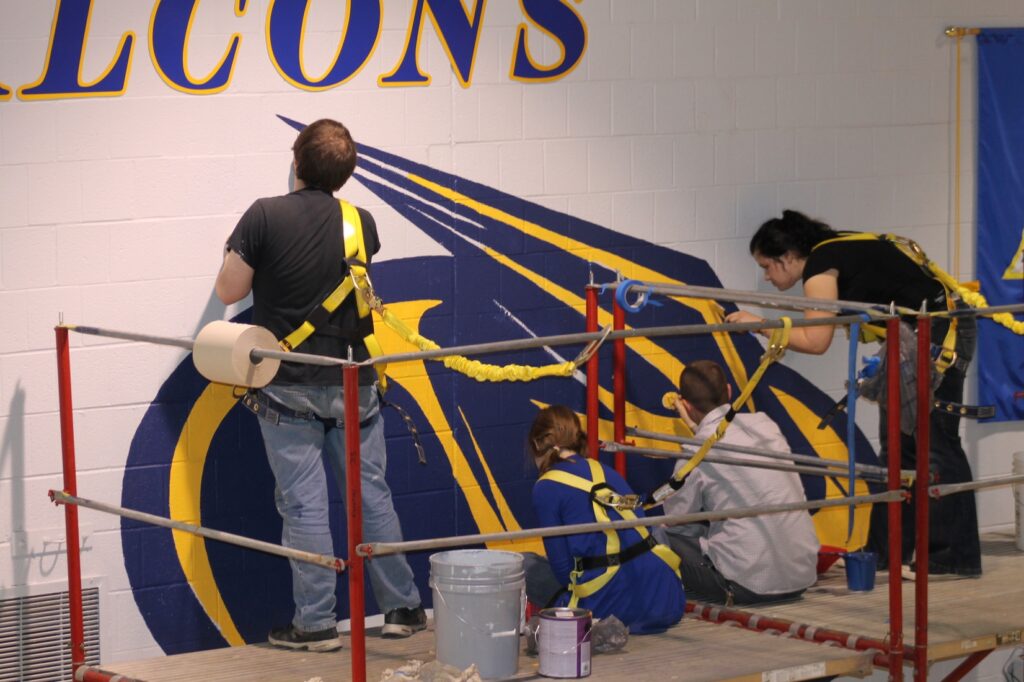 Hannah Lucas of Eldorado, Kelsey Kraper of Golconda, and Justin Jones of Norris City were chosen to paint the new SIC Falcon. With direction from art instructor and professional working artist, Brent Webb, the trio – all attending SIC on art scholarships – worked quickly and diligently to complete the mural.