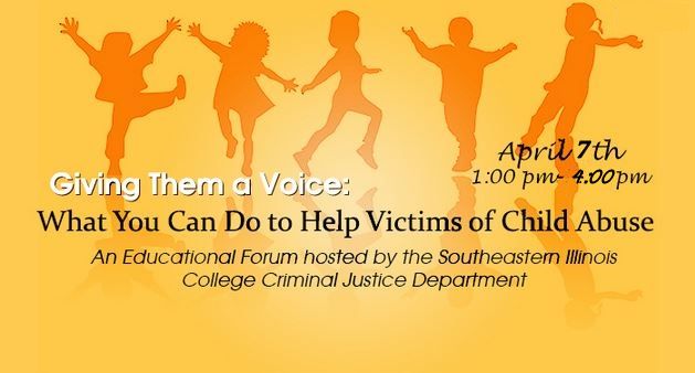 In honor of National Child Abuse Prevention Month, the Southeastern Illinois College Criminal Justice department is sponsoring an educational forum on April 7, 1 – 4 p.m. The 2nd Annual Giving Them a Voice: What You can Do to Help Victims of Child Abuse will feature breakout sessions, a panel discussion and informational tables where those in attendance will learn about topics ranging from child abuse signs and symptoms to the role of child advocacy centers in child abuse investigations.