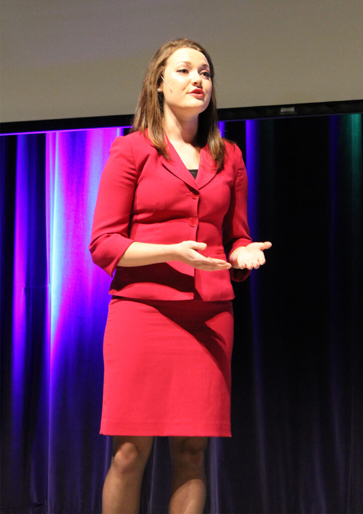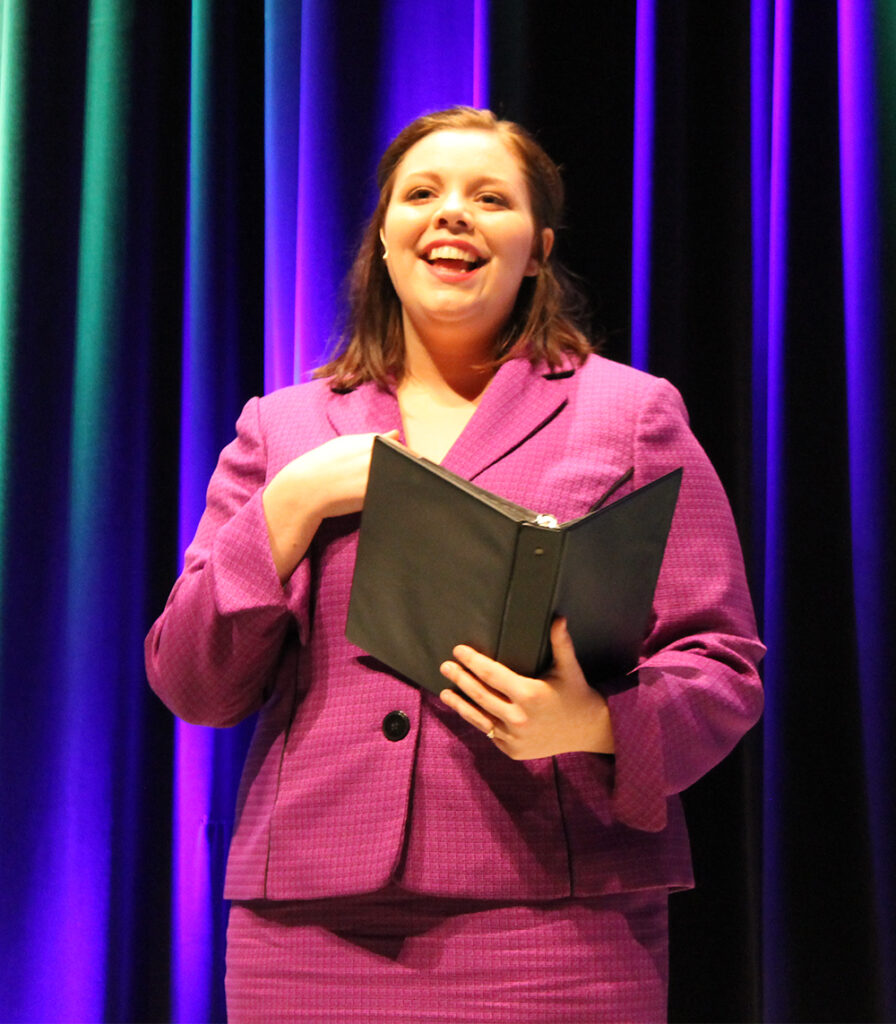 Britta Suits of Broughton, with audience assistance, demonstrated impromptu speaking.  The audience was asked to provide three quotes, and Suits had a total of seven minutes to prepare and deliver a speech. Of the three, she chose, “Not all who wander are lost,” from The Lord of the Rings.
