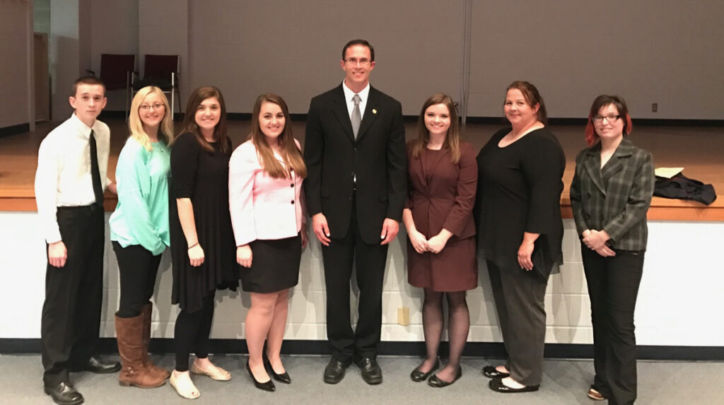 Southeastern Illinois College Student Government members and officers along with WEBQ hosted a Candidate Forum featuring state and local candidates for Saline County on Thursday, Oct. 27. Pictured are (l-r) SIC Student Government members William Johnson of Eldorado and Rachel Carr of Elizabethtown; and SIC Student Government officers Rachel Mace of Eldorado, Secretary; Brooklyn Beckham of Eldorado, Vice President; Matt Lees, SIC Government Instructor; Bridget Fitzpatrick of Eldorado, Student Trustee; Dana Hooven of Harrisburg, President; and Stephanie Johns of Omaha, Treasurer.
