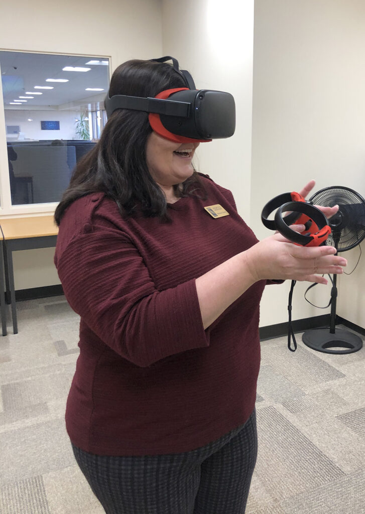 The new space also provides students with a modern area to use for reading and relaxing with a faux fireplace and other lounging areas, use of various electronic devices in places like the cyberbar, homework in groups meeting spaces or in solo study pods, larger collaborative workspaces with floor-to-ceiling whiteboards and screen-sharing monitors, games and puzzles that include a Lego station, virtual reality experiences, 3D printing opportunities and more.