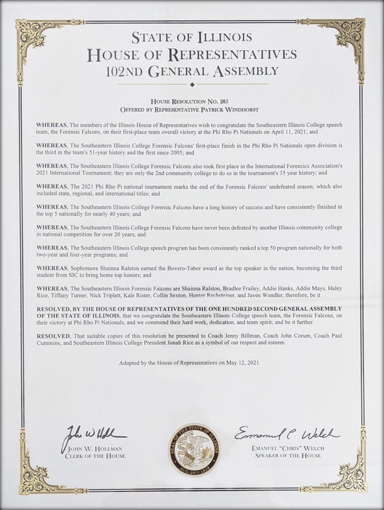 Rep. Windhorst presented House Resolution 285 of the 102nd Illinois General Assembly to the SIC Forensic Falcons which he prepared and filed after hearing of the team’s recent unprecedented season of competitive success. While presenting the resolution, which was adopted and approved May 12 of this year, Windhorst commended team members for their efforts, encouraging them to use their talents to make the most of every opportunity that comes their way. He also noted that it was an honor to be able to ensure that the team’s achievements would be recorded in Illinois state history “for all time.”