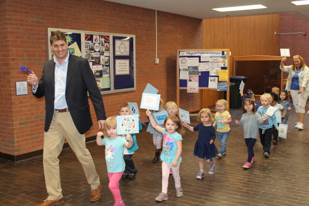 Harrisburg Mayor, John McPeek, leads the children from the Mary Jo Oldham Center for Child Study in their annual Child Abuse Prevention parade through the…